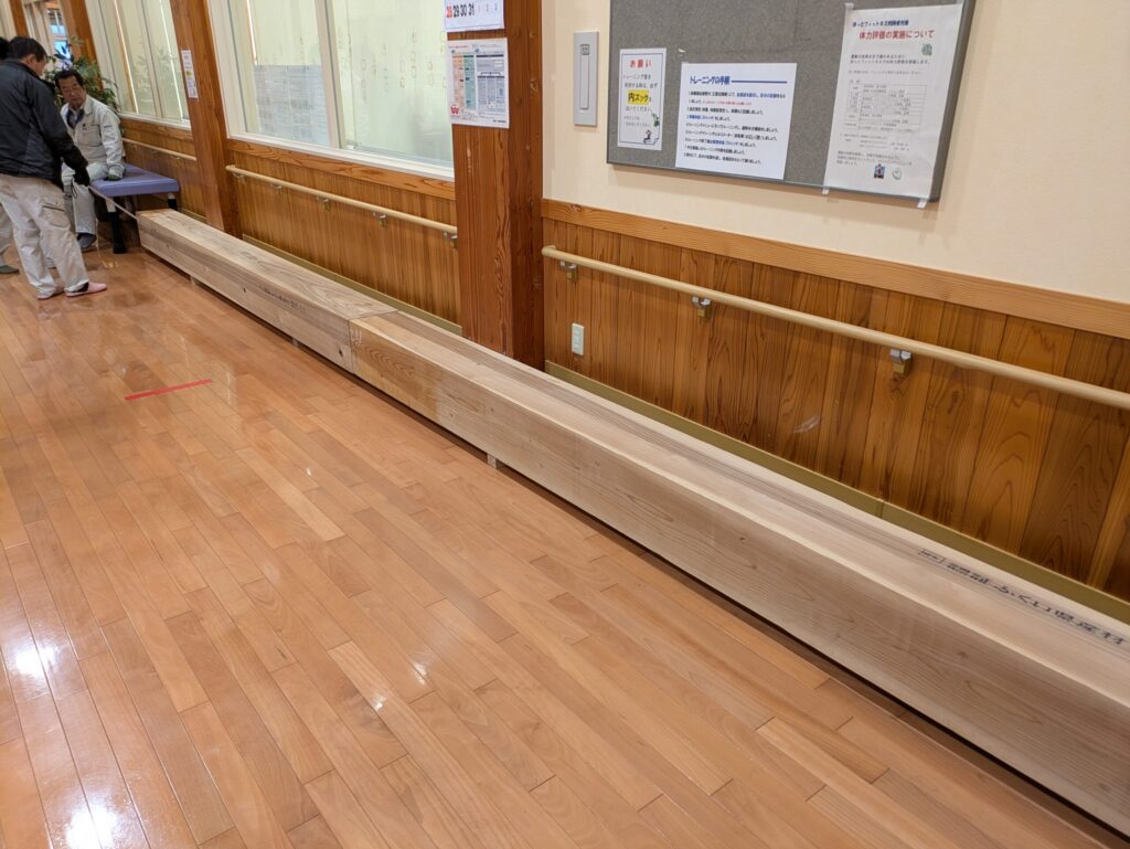 ほっとプラザトレーニングルームの壁際に配置した組立柱です。1本の長さが4メートルのものを2本並べて配置しました。少し低いですが腰掛としても利用できます。