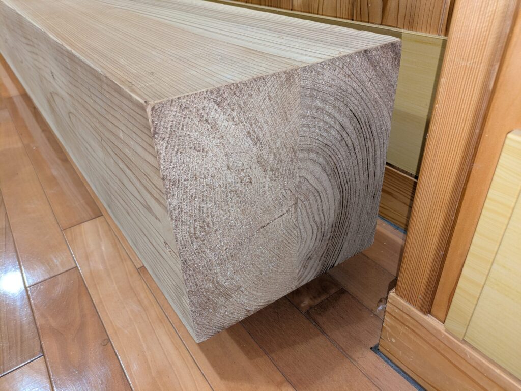 柱の断面を見ると2本の製材を組み合わせていることがわかります。建築に影響が出ないよう、組み合わせを行う際、強度試験を行い、強度の近いもの同士を組み合わせています。