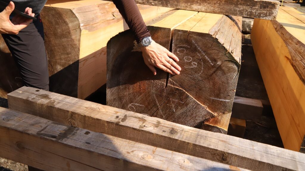 木を切ったあとは、丸太を柱用の角材に加工する工程があります。通常の木造建築では、丸太を薄い板状に切って再接着した「集成材」を使用することが多いですが、わたしたちは、できる限り加工がシンプルな「製材」で設計することを心がけました。