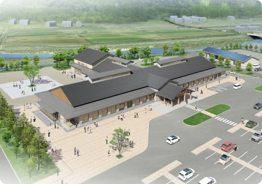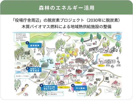 建物で使う木材の多くが町内の森林資源から生まれ、冷暖房に木質バイオマスを利用することで、地域資源の循環・有効活用を図ります。伐採→製材→建築・エネルギー→暮らし→再び森へ、という持続可能なサイクルを見える形で伝えることが、この施設の役割です。町が持つ資源を「守り」「育て」「活かす」ことが地方創生につながることを示しています。