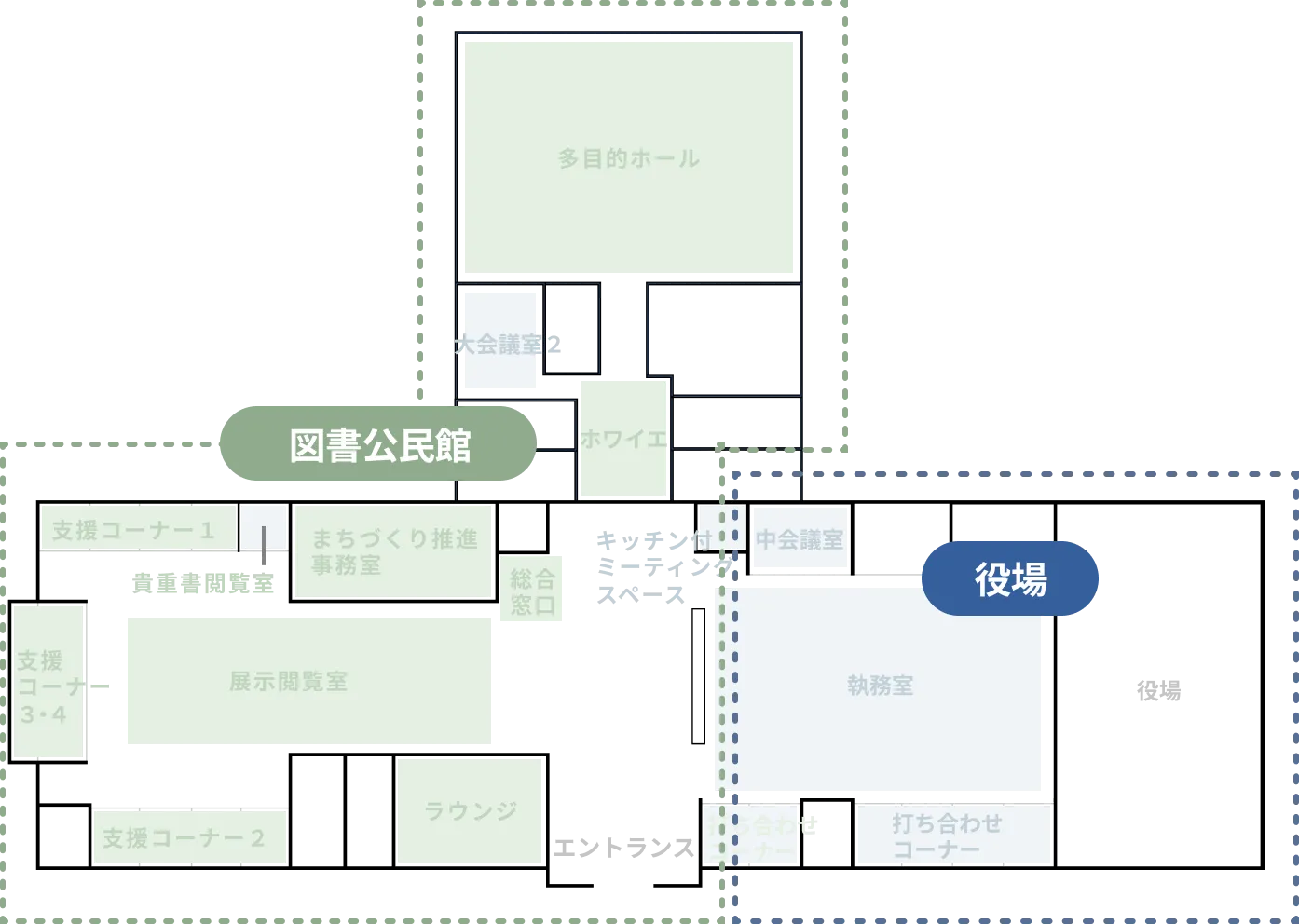 行政窓口機能を集約化することで、町民の皆様の利便性が向上します。手続きの待ち時間にオープンスペースを利用したり企画展示を閲覧することもできます。役場職員と町民が気軽に打ち合わせできるスペースも用意しています。